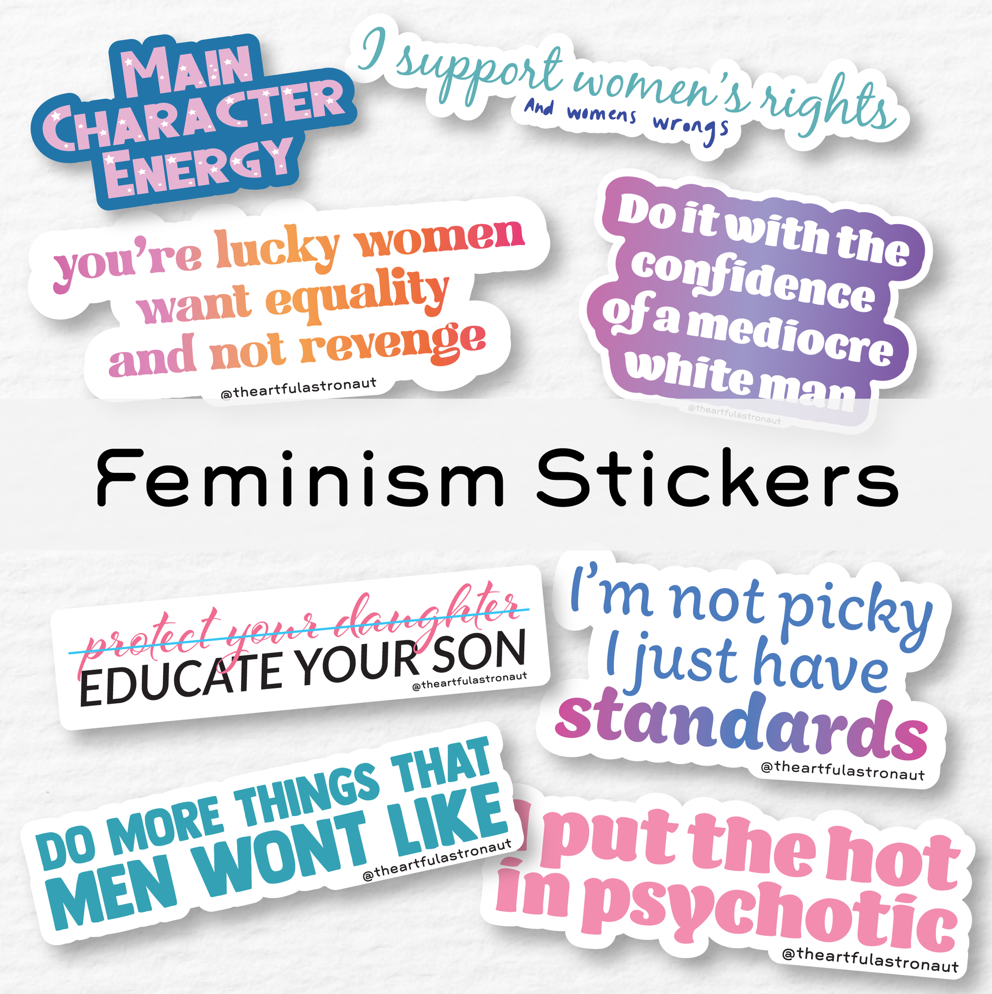 If you get the set of 14 I will include the 8 feminism stickers, plus 6 more random stickers from either our self-care sticker set, or workplace survival set. Similar in theme!