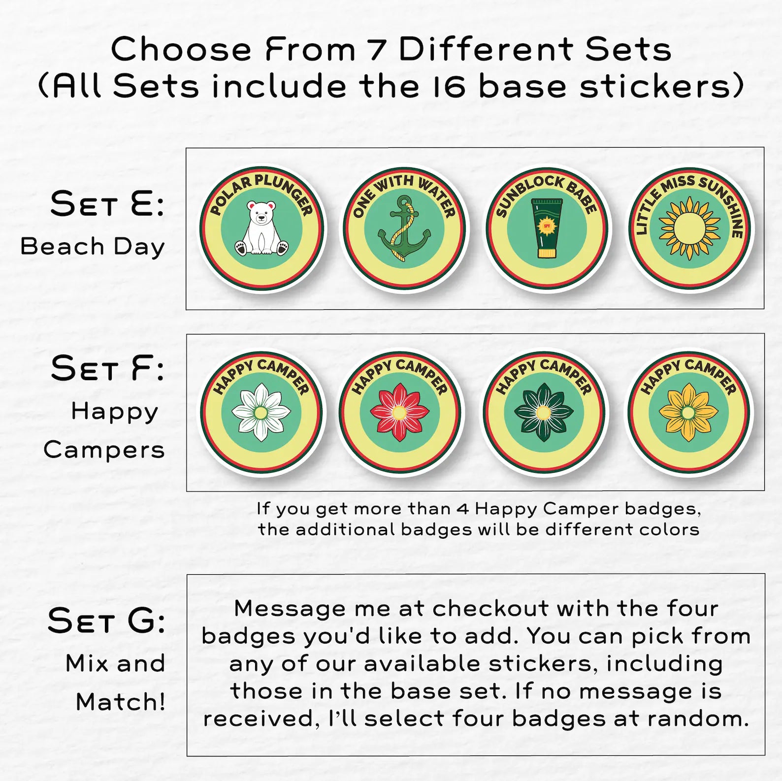 Every set includes the following 16 stickers: Documentarian, Master Chef, Decision Maker, Social Butterfly, Clean-Up Crusader, Card Shark, Dancing Queen, Crafty Pants, Gratitude Guru, Event MVP, Dessert Dynamo, Karaoke Star, Superb Supporter, Fashion Icon, Trivia Titan and Storyteller.